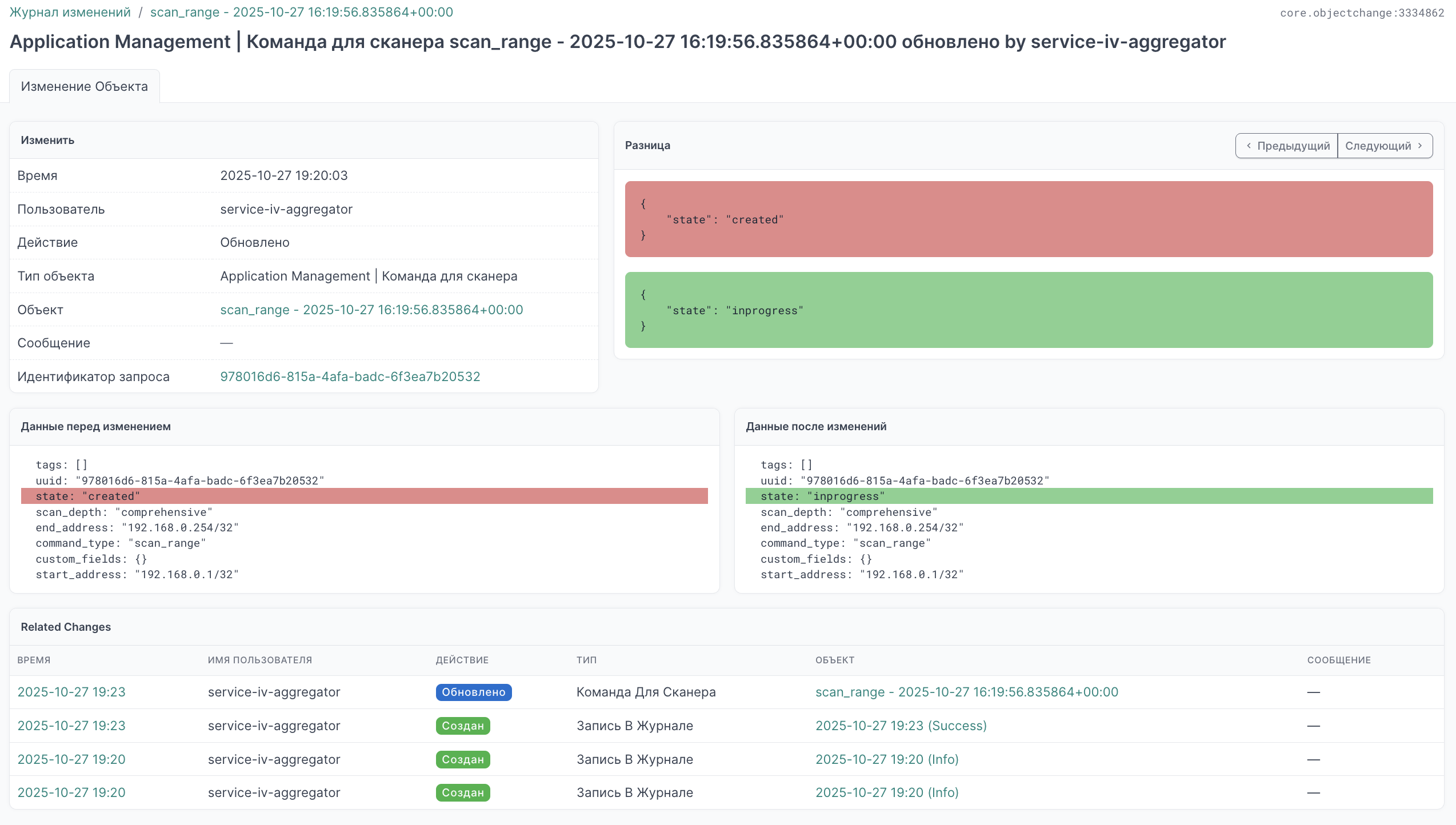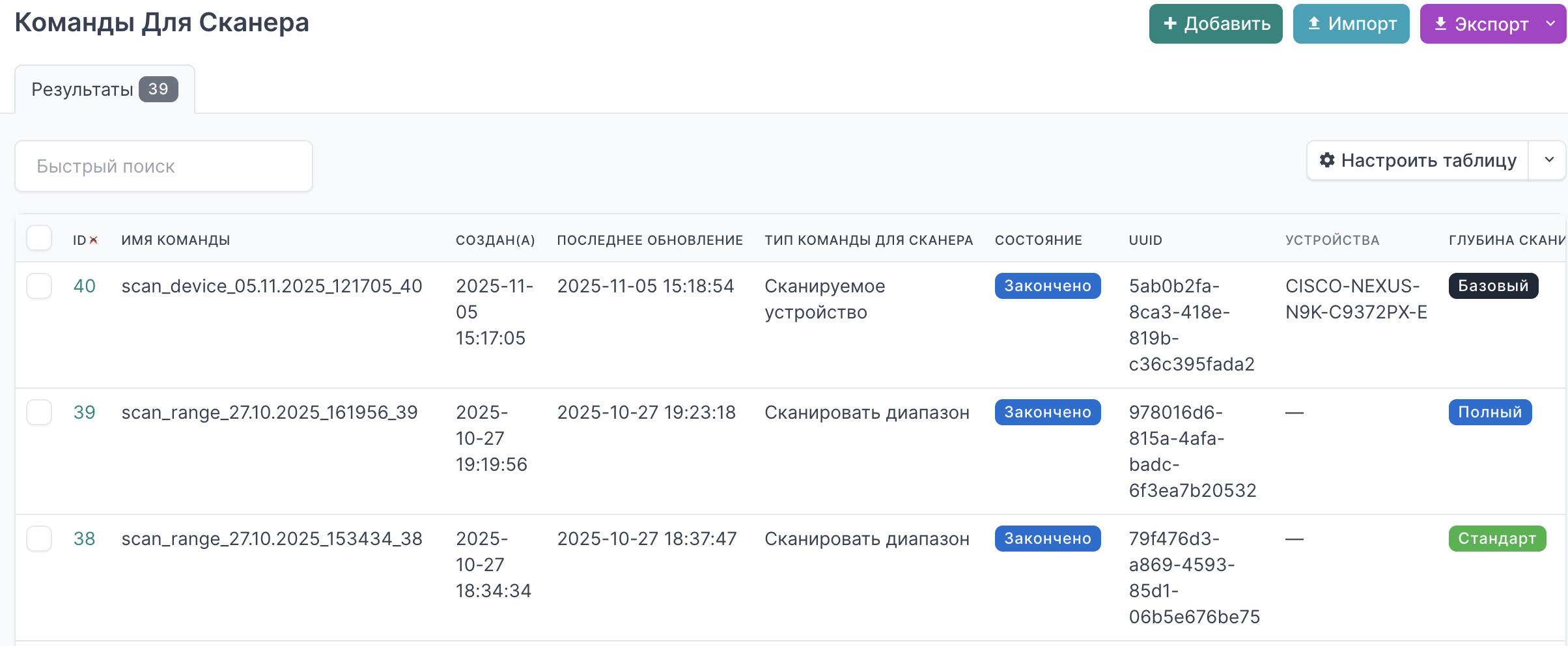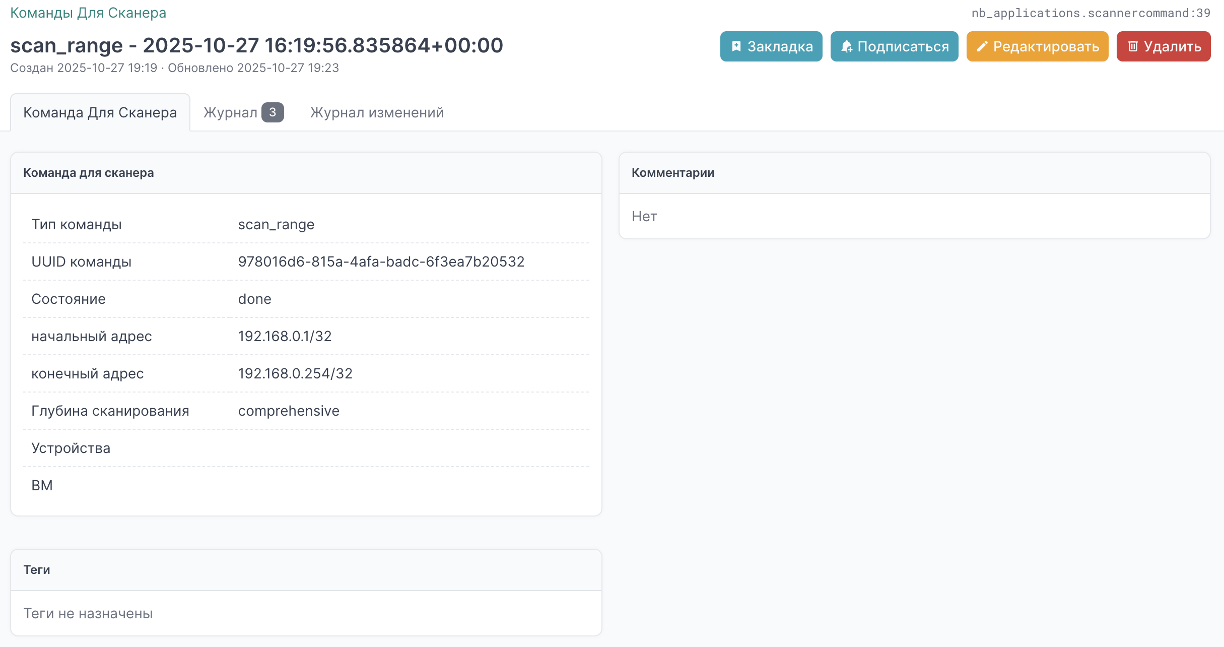 На странице доступна информация о типе команды, состоянии выполнения, глубине сканирования и параметры команды.